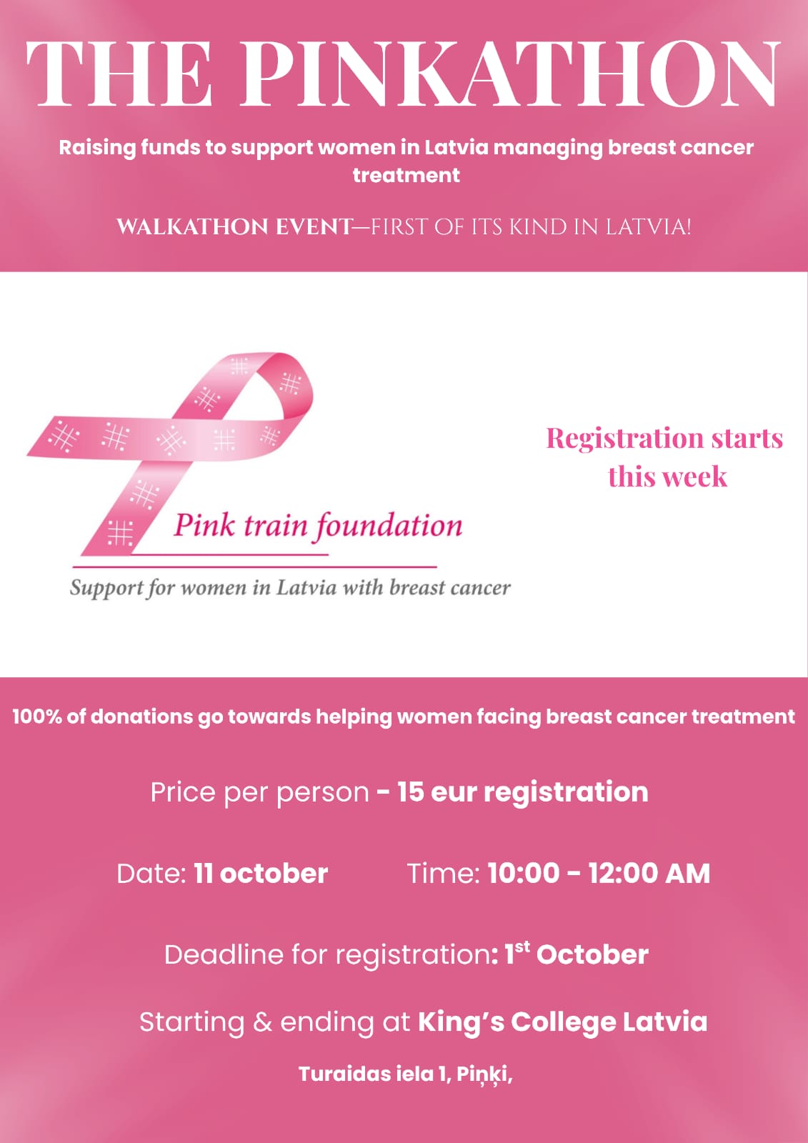 Support IWCR Charity, Pink Train, and King’s College School in Rīga. Students are organizing the Pinkathon on October 11 – a walkathon to raise funds for the Pink Train Foundation